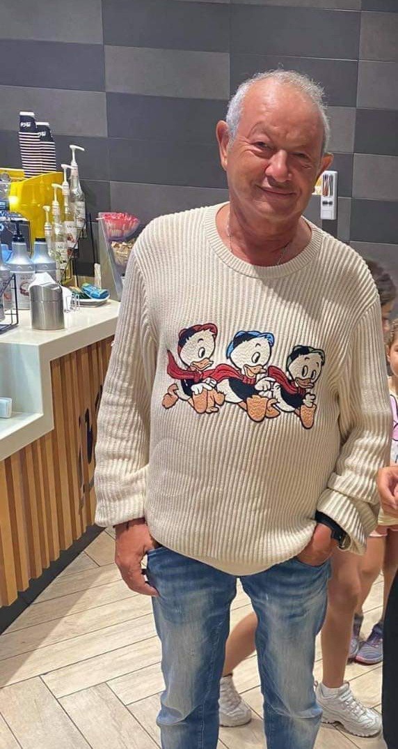 ظهر ساويرس بتشيرت بكم باللون البيج الفاتح، في صور عدة متداولة وعليه 3 أشكال من بطوط، في إطلالة غريبة عنه، وتبين أن التيشيرت تابع لشركة جوتشي الشهيرة.