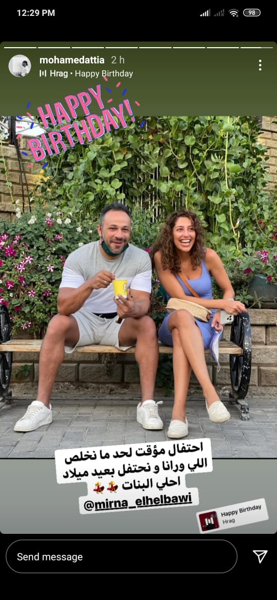 ونشر محمد عطية صورة تجمعه مع ميرنا عبر خاصية ستوري لحسابه الشخصي على موقع تبادل الصور والفيديوهات القصيرة انستجرام، وعلق قائلًا: احتفال مؤقت لحد ما نخلص اللي ورانا ونحتفل بعيد ميلاد أحلى البنات.