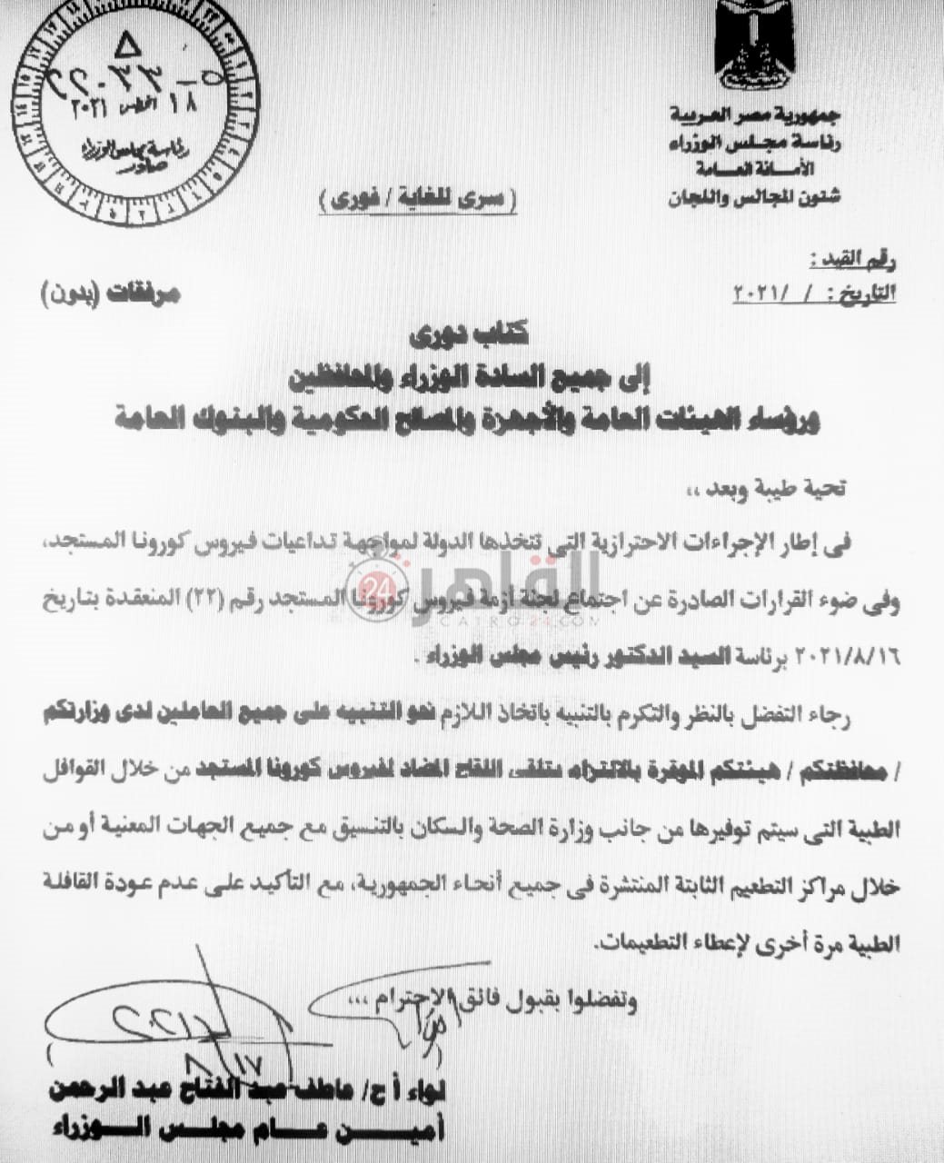 حسب المصادر الحكومية، فإن القرار يتضمن عمل حصر لكافة الموظفين في الجهاز الإداري للدولة لحصولهم على التطعيم بلقاح فيروس كورونا المستجد، على أن يتم الانتهاء من عمليات التطعيم لكافة العاملين في الجهاز الإداري للدولة نهاية شهر سبتمبر المقبل من خلال القوافل الطبية الثابتة والمنتشرة في أنحاء الجمهورية.