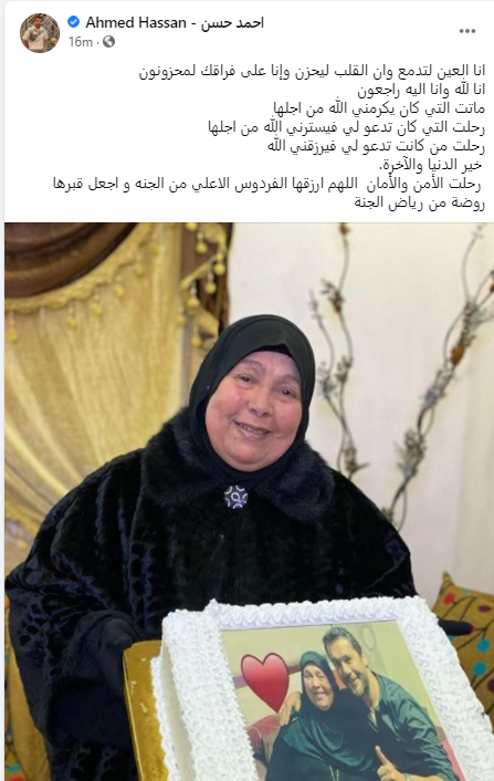 وقال أحمد حسن عبر صفحته الرسمية على فيس بوك: إن العين لتدمع وإن القلب ليحزن وإنا على فراقك لمحزونون، إنا لله وانا اليه راجعون، ماتت التي كان يكرمني الله من أجلها، رحلت التي كانت تدعو لي فيسترني الله من أجلها، رحلت من كانت تدعو لي فيرزقني الله، خير الدنيا والآخرة.