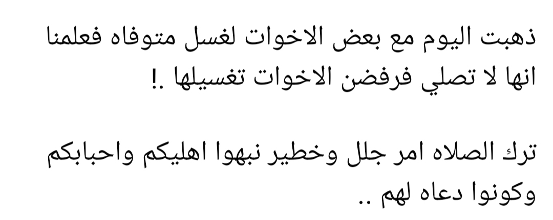 وكتبت صفحة باسم ريهام عبدالرحمن منشور تقول فيه: ذهبت اليوم مع بعض الأخوات لغسل متوفاة، فعلمنا أنها لا تصلي فرفضن الأخوات تغسيلها".
