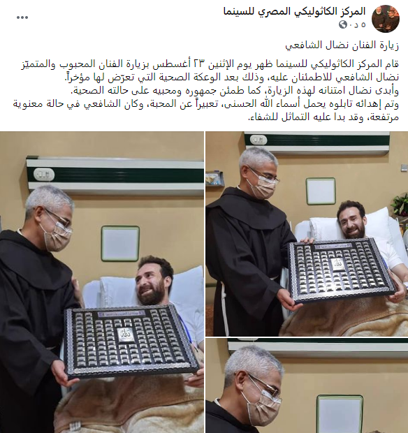 وتابع الحساب الرسمي للمركز الكاثوليكي: وأبدى نضال امتنانه لهذه الزيارة، كما طمئن جمهوره ومحبيه على حالته الصحية، وتم إهدائه تابلوه يحمل أسماء الله الحسنى، تعبيرا عن المحبة، وكان الشافعي في حالة معنوية مرتفعة، وبدا عليه التماثل للشفاء.