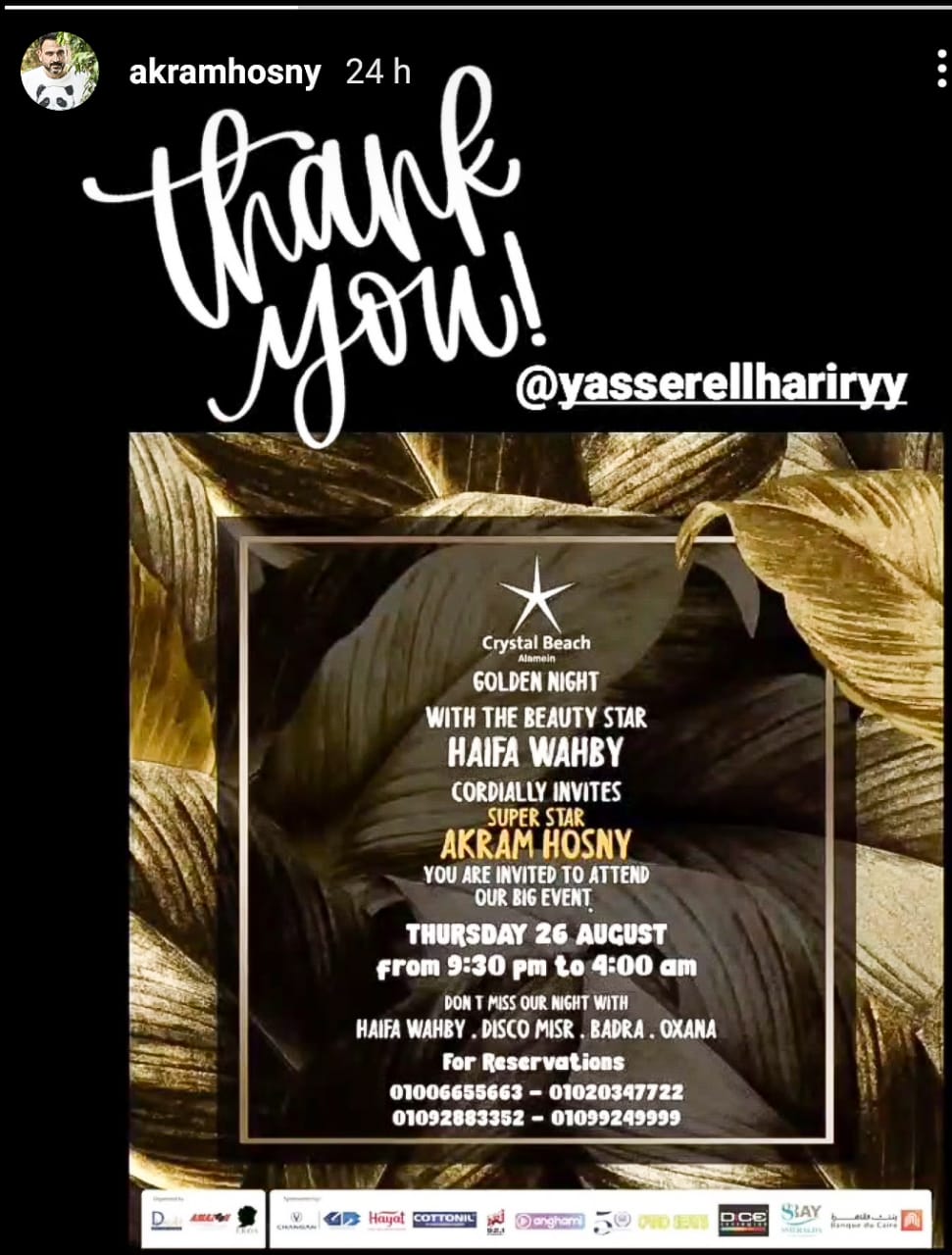حرص الفنان أكرم حسني على توجيه كلمة شكر لمنظم الحفل ال dj العالمي ياسر والقائمين عليه لدعوته لحضور الحفل، وذلك عبر خاصية الاستوري بحسابه علي إنستجرام.