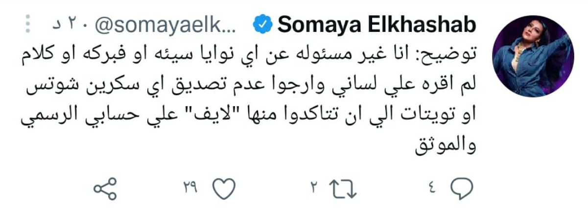 وكتبت سمية الخشاب، تدوينة عبر حسابها الشخصي على موقع التغريدات القصيرة تويتر، وقالت: «توضيح: أنا غير مسئولة عن أي نوايا سيئة أو فبركة أو كلام لم أقوله على لساني».