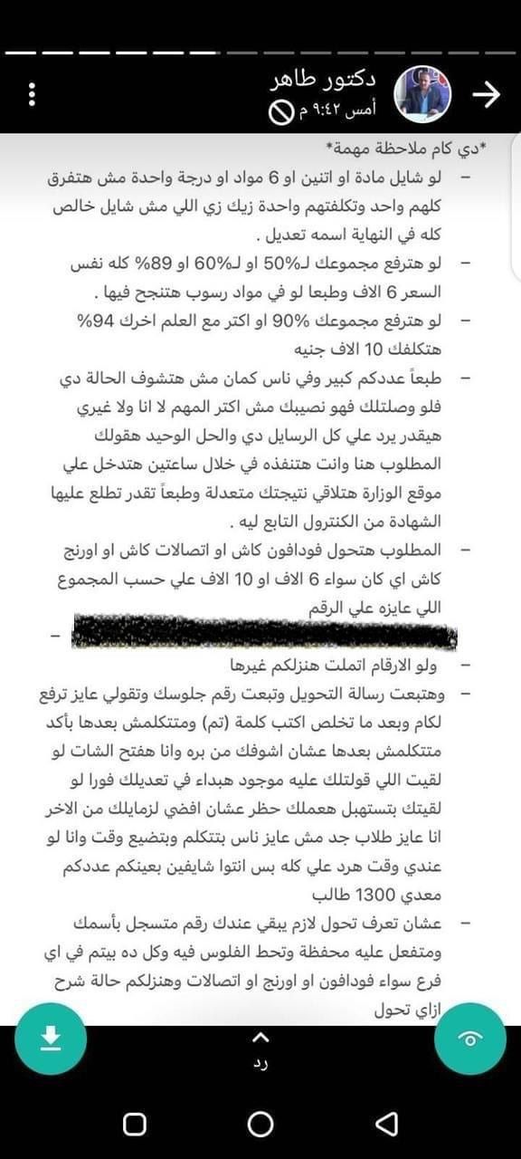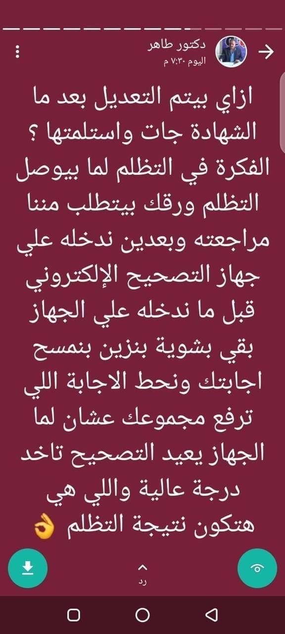 وكتب في رسائله للطلاب وأولياء الأمور: «إزاي يتم التعديل بعد ما الشهادة جات واستلمتها؟ الفكرة في التظلم لما بيوصل التظلم ورقك بيتطلب مننا مراجعته وبعدين ندخله على جهاز التصحيح الالكتروني قبل ما ندخله على الجهاز بقي بشوية بنزين بنمسح إجابتك ونحط الإجابة اللي ترفع مجموعك عشان لما الجهاز يعيد التصحيح تاخد درجة عالية واللي هي نتيجة التظلم».