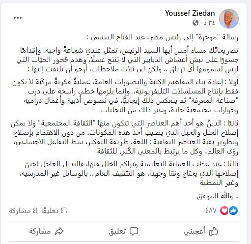 وقال زيدان، عبر صفحته بموقع التواصل الاجتماعي فيس بوك: «تصريحاتُك مساء أمس أيها الرئيس، تمثل عندي شجاعةً واجبة، وإقدامًا جسورًا على نبش أعشاش الدبابير التي لا تنتج عسلًا، وهدم جُحور الحيّات التي ليس لسمومها أي ترياق.. ولكن لي ثلاث ملاحظات، أرجو أن تلتفت إليها.. أولًا: إعادة بناء المفاهيم الكلية والتصورات العامة، عمليةٌ فكريةٌ مركّبة لا تكون فقط بإنتاج المسلسلات التليفزيونية.. وإنما يلزمها خطى راسخة على درب صناعة المعرفة، ثم ينعكس ذلك إيجابيًّا، في نصوص أدبية وأعمال درامية وحوارات مجتمعية جادة، وغير ذلك من التجليات».