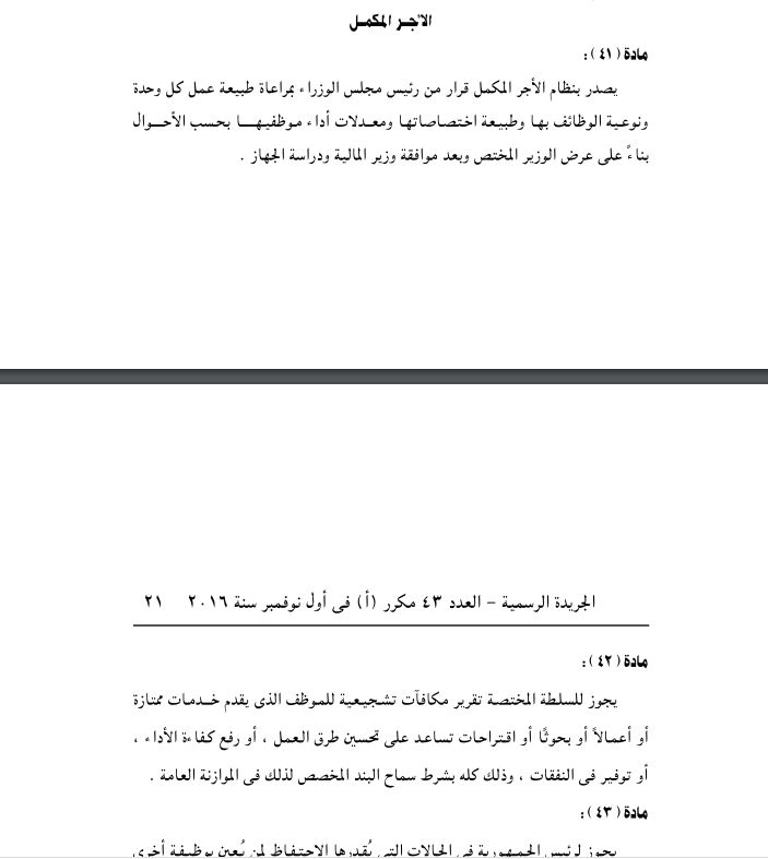 المادة 74 من قانون الخدمة المدنية، تنص على حق الموظف الخاضع لقانون الخدمة المدنية رقم 81 لسنة 2016، بالحصول على الأجر المكمل، والذي يشمل المكافآت، الحوافز، البدلات، بأنواعها - أي كل ما يرد بخلاف الأجر الوظيفي الأساسي.