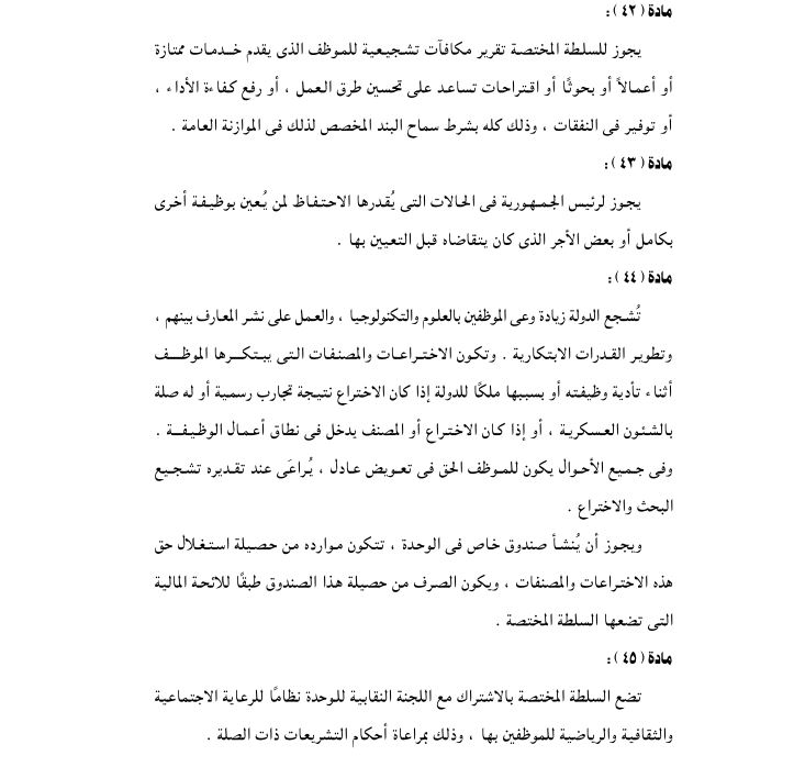 أما المادة 42 من القانون، فتنص على جواز أن تقرر السلطة المختصة صرف مُكافآت تشجيعية للموظف الذي يُقدم خدمات ممتازة أو أعمالًا أو بحوثًا، تساعد على رفع كفاءة الأداء، وتحسين طرقه.