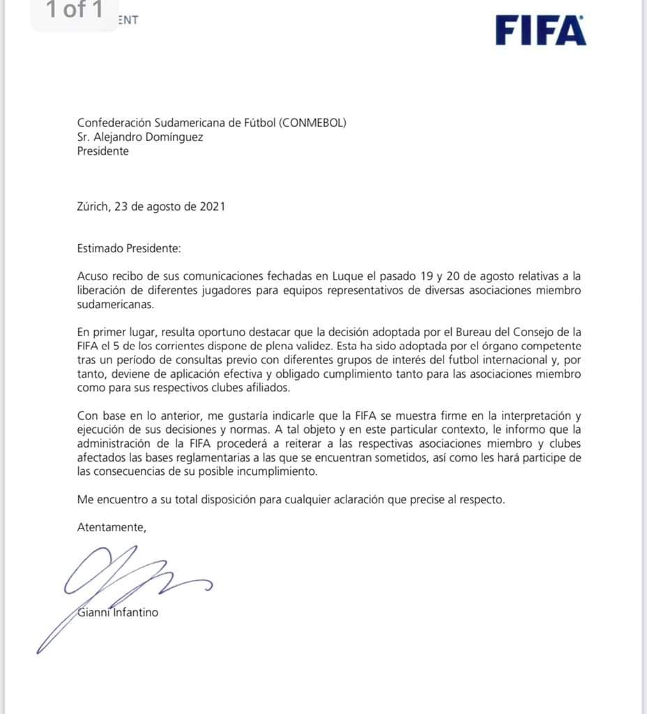 وقالت فيفا في بيانها عبر موقعها الرسمي: سنحرص على حصول منتخبات أميركا الجنوبية على لاعبيها الدوليين المحترفين في أوروبا الأسبوع المقبل لخوض تصفيات كأس العالم 2022 وإلا ستكون هناك عواقب وخيمة.