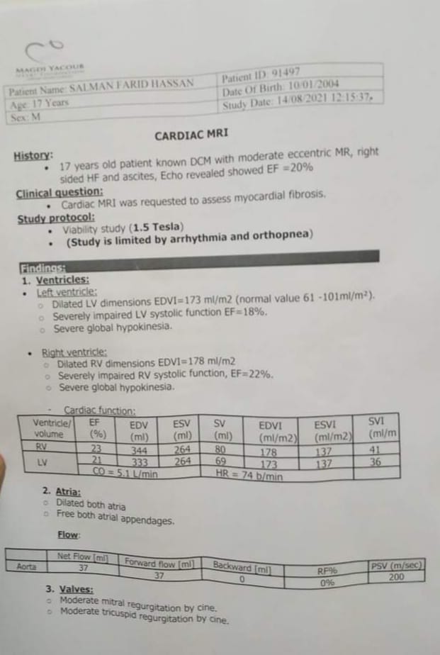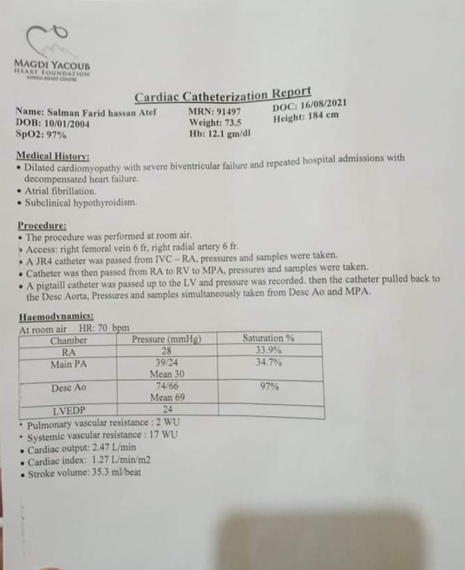 بعد ظهور التحاليل والفحوصات، واطلاع الدكتور مجدي يعقوب على نتائجها، جاء الرد بأن سلمان يحتاج إلى عملية زراعة قلب، وهي غير متوفرة في مصر، وذلك نظرًا لوجود مشاكل صحية في كلًا من البطينين الأيمن والأيسر، ما يجعل وضع جهاز دعامة للقلب بلا جدوى.