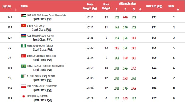وحصل الفيتنامي كونج فان على الميدالية الفضية في منافسات رفع الأثقال بدورة الألعاب البارالمبية، بينما حصد الأذربيجاني مامادوف الميدالية البرونزية.