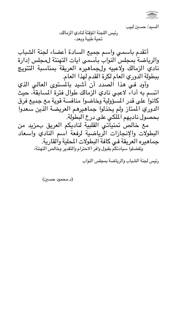 رئيس لجنة الشباب، قال في برقية التهنئة التي أرسلها إلى حسين لبيب، رئيس اللجنة المؤقتة لنادي الزمالك: أتقدم باسمي واسم جميع السادة أعضاء لجنة الشباب والرياضة بمجلس النواب بأسمى آيات التهنئة لمجلس إدارة نادي الزمالك ولاعبيه ولجماهيره العريقة، بمناسبة التتويج ببطولة الدوري العام لكرة القدم لهذا العام.