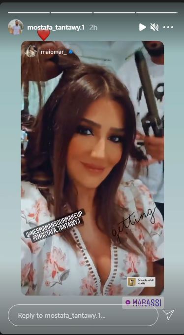 ونشر بعدها مصطفي طنطاوي فيديو عبر خاصية الاستوري للفنانة مي عمر وهو يصفف لها شعرها استعدادا للمناسبة.