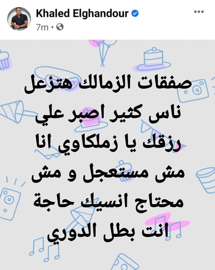 وكتب خالد الغندور، على صفحته الشخصية، عبر موقع التواصل الاجتماعي فيس بوك: صفقات الزمالك هتزعل ناس كثير اصبر على رزقك يا زملكاوي أنا مش مستعجل ومش محتاج أنسيك حاجة إنت بطل الدوري.
