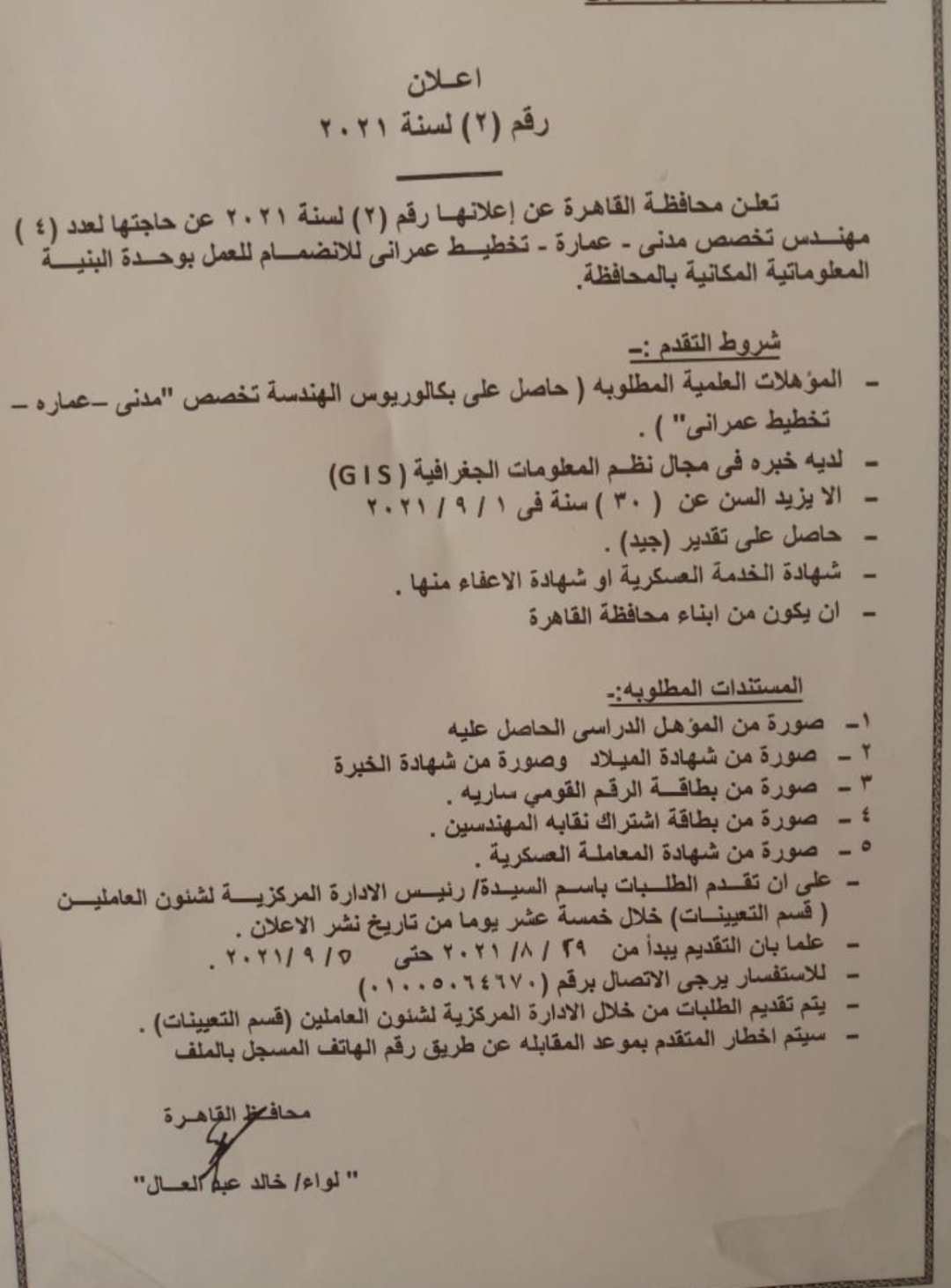 أعلنت محافظة القاهرة في إعلانها رقم 2 لسنة 2021 عن حاجتها لعدد 4 مهندس تخصص مدنی - عمارة - تخطيط عمراني للانضمام للعمل بوحدة البنية المعلوماتية المكانية بالمحافظة.