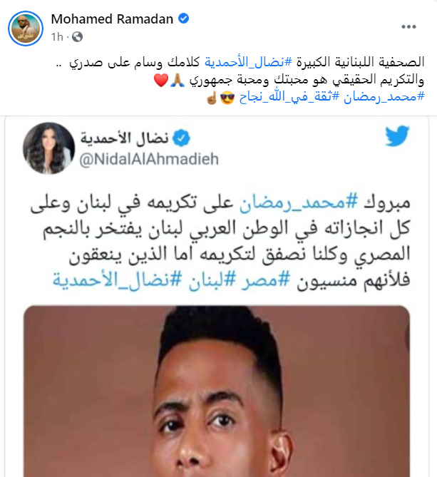ونشر الفنان محمد رمضان عبر صفحته الرسمية علي موقع التواصل الإجتماعي فيس بوك صورة لتغريدتها، وهى تقول فيها: «مبروك محمد رمضان على تكريمه فى لبنان وعلى كل إنجازاته لبنان يفتخر بالنجوم محمد رمضان وكلنا نصف لتكريم اما الذين ينعقون فلأنهم منسيون».