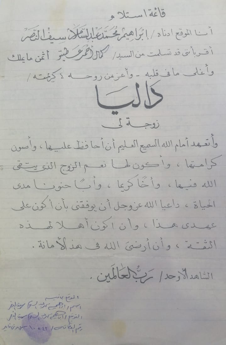 «من يؤتمن على العرض لا يسأل عن المال.. اتق الله في كريمتنا.. أتعهد أمام الله بأن أكون لها نعم الزوج».. عبارات كتبها أشخاص مختلفون وأيضًا عبر أزمنة مختلفة، آباء قرروا أن يستبدلوا قوائم المنقولات الخاصة لبناتهم بتعهد آخر بالحفاظ عليهن وإكرامهن، والشاهد الأوحد عليهم هو رب العالمين عز وجل.