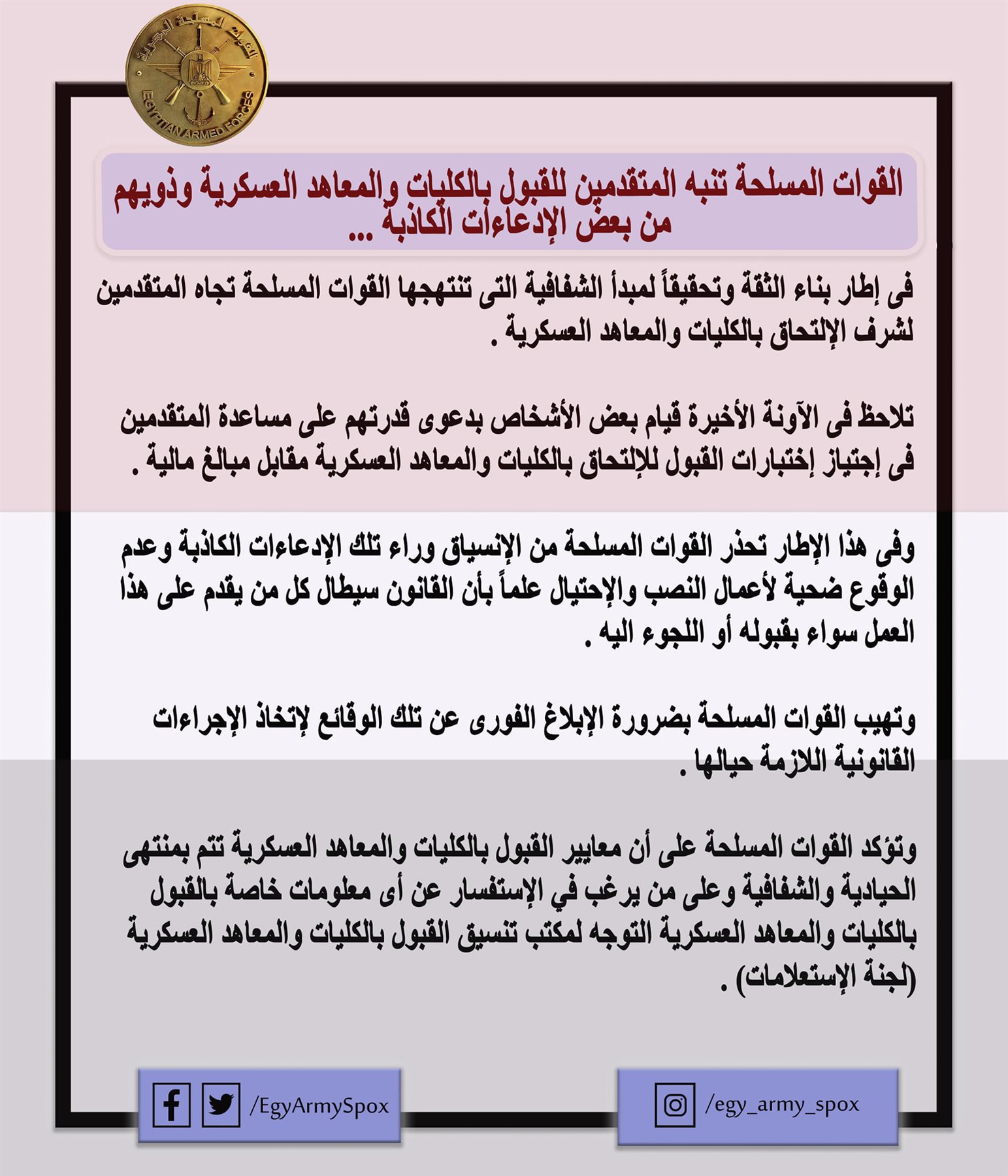 كما أهابت القوات المسلحة بضرورة الإبلاغ الفوري عن تلك الوقائع لاتخاذ الإجراءات القانونية اللازمة حيالها. وتؤكد القوات المسلحة على أن معايير القبول بالكليات والمعاهد العسكرية تتم بمنتهى الحيادية والشفافية وعلى من يرغب في الاستفسار عن أي معلومات خاصة بالقبول بالكليات والمعاهد العسكرية التوجه لمكتب تنسيق القبول بالكليات والمعاهد العسكرية «لجنة الاستعلامات».