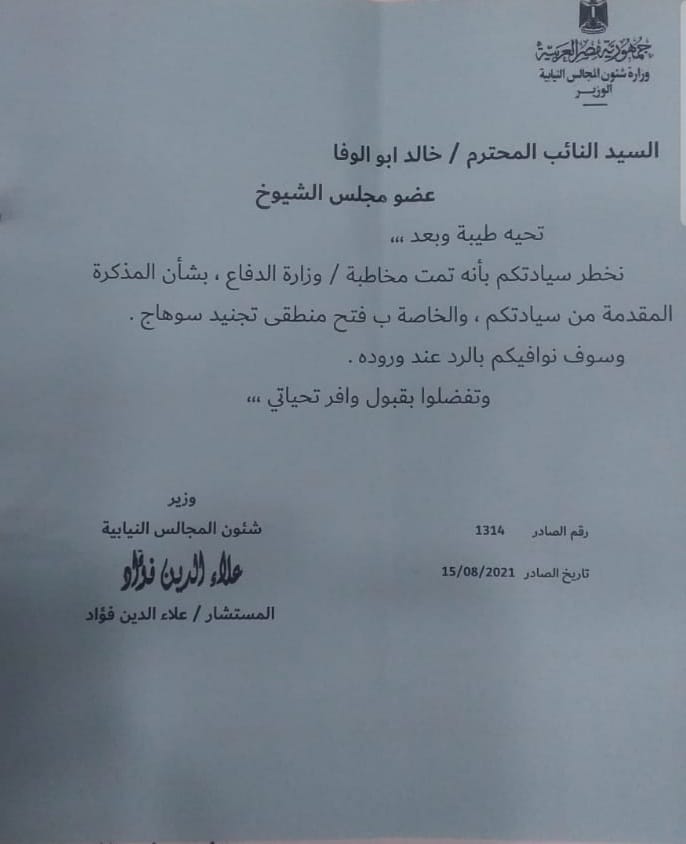 تقدّم النائب خالد أبو الوفا، عضو مجلس الشيوخ، بطلب إلى وزارة الدفاع، بشأن إنشاء منطقة تجنيد بمحافظة سوهاج، وذلك لرفع معاناة الأهالي والمجندين من الذهاب والإياب إلى منطقة تجنيد أسيوط، مؤكدًا في طلبه أنها تبعد عن محافظة سوهاج 114كم.