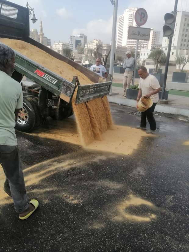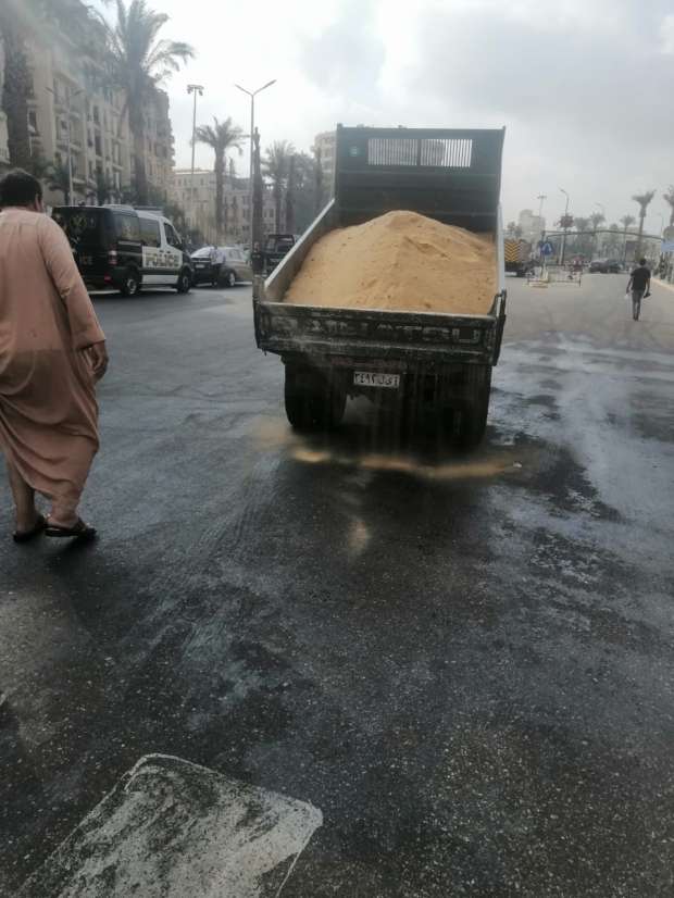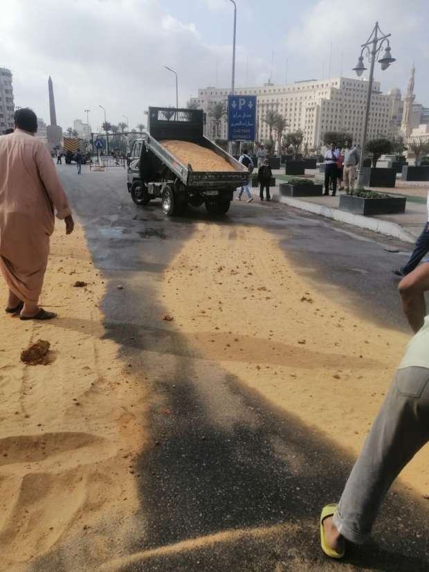 فتح ميدان التحرير أمام الحركة المرورية بعد الاستعانة بالرمال لتغطية آثار الزيوت| صور