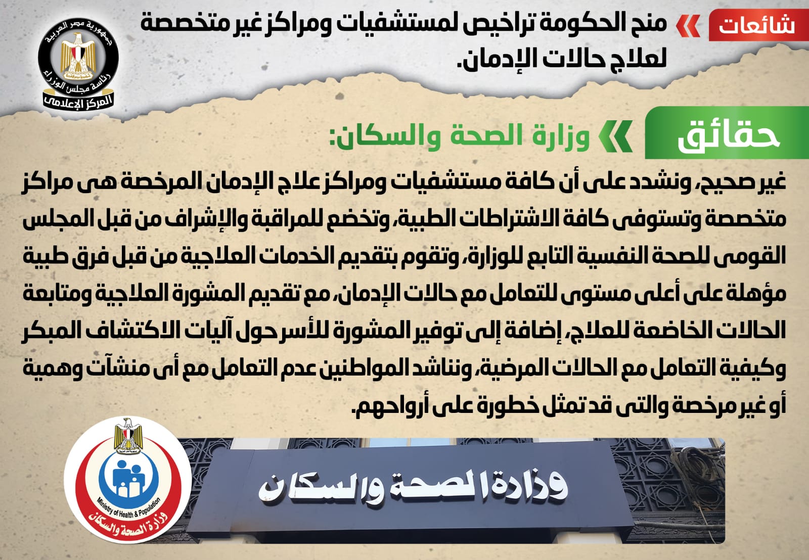 وتواصل المركز الإعلامي لمجلس الوزراء مع وزارة الصحة والسكان، والتي نفت تلك الأنباء، مُؤكدةً أنه لا صحة لمنح تراخيص لمستشفيات ومراكز غير متخصصة لعلاج حالات الإدمان.