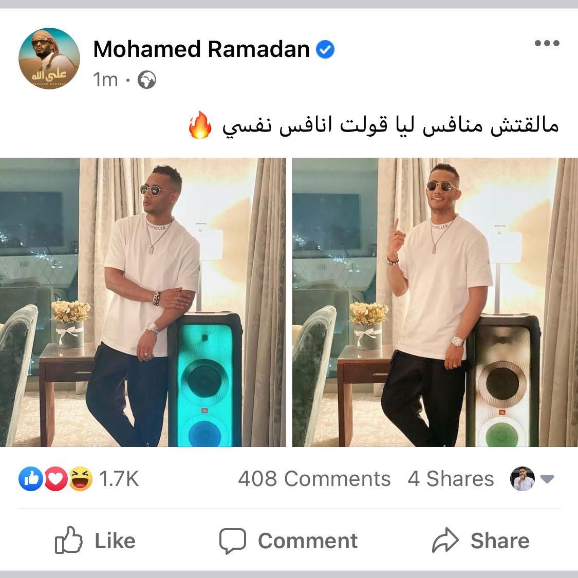 وكتب محمد رمضان، على منشور مقطع من أحدث أغانيه التي تحمل اسم «علي الله»، حيث قال: «مالقتش منافس ليا قولت انافس نفسي».