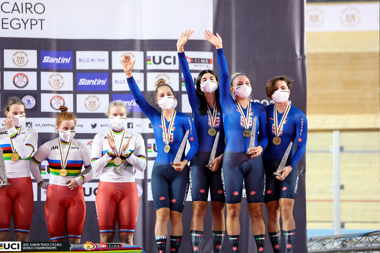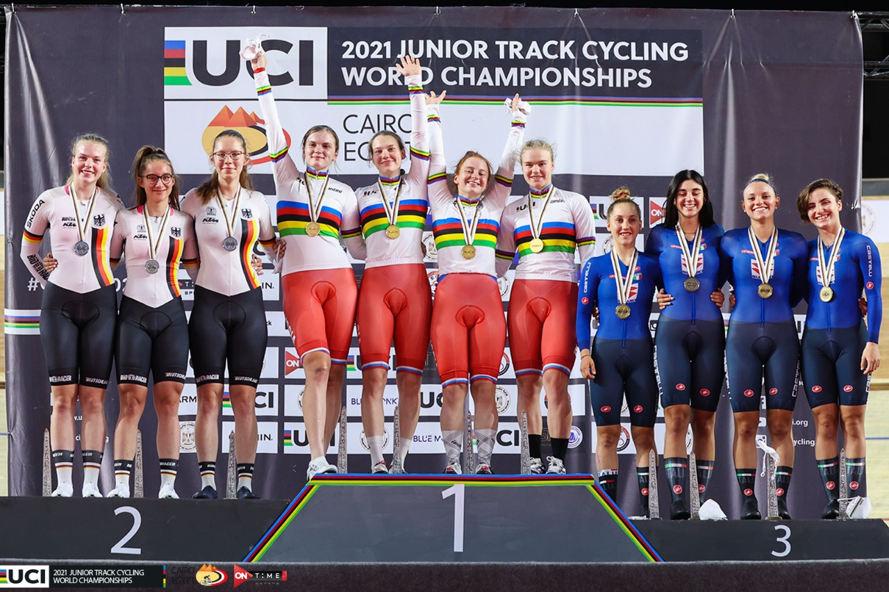 سلّم انريكو ديلا كاسا، رئيس الاتحاد الأوروبي للدراجات، الألمانية جيتي سيمون الميدالية الذهبية بعد فوزها بالمركز الأول في منافسات فردي الاسكراتش سيدات ببطولة العالم للناشئين لدراجات المضمار والتي تستضيفها مصر بمضمار الدرجات باستاد القاهرة، في الفترة من 1 إلى 5 سبتمبر الجاري، تحت رعاية الرئيس عبد الفتاح السيسي.