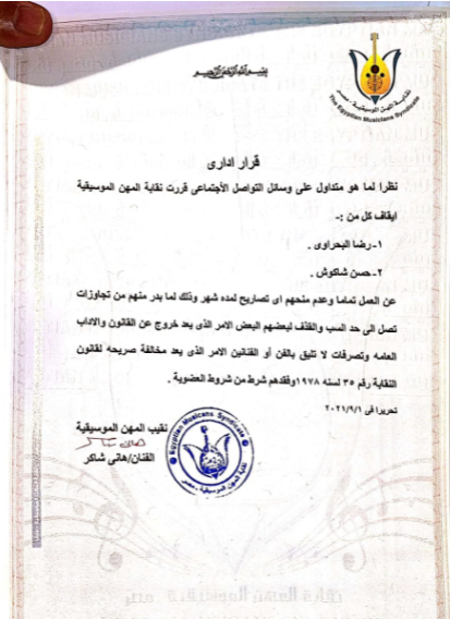 أصدرت نقابة المهن الموسيقية بيانًا خاصًا بأزمة مطربي المهرجانات حسن شاكوش ورضا البحراوي، والتي قررت وقف مغني المهرجانات حسن شاكوش والمطرب رضا البحراوي لمدة شهر، وذلك لما بدر منهما من كلمات بذيئة وإشارات إباحية، أثناء إحيائهما حفلًا غنائيًا بالساحل، وهو ما انتقدته النقابة.