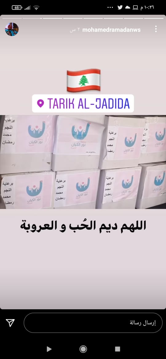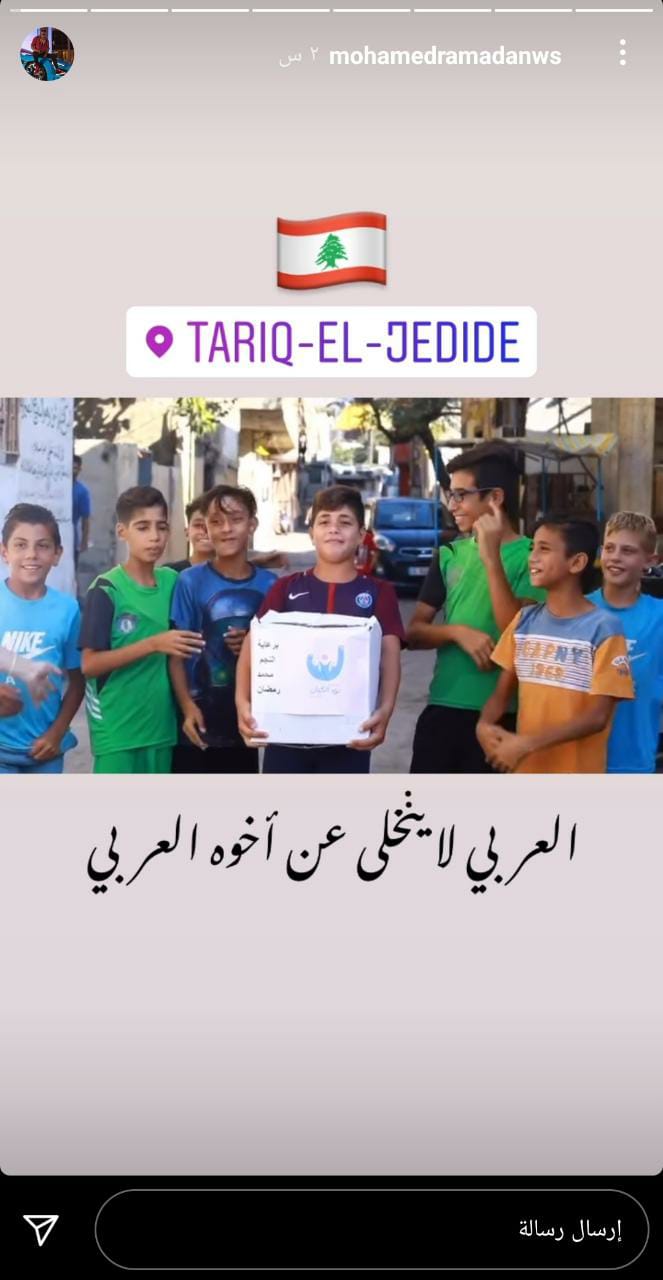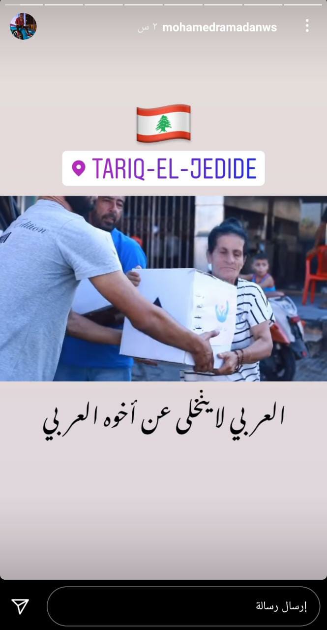 نشر الفنان محمد رمضان فيديو، للفريق الخاص به خلال تقديمهم المساعدات للأهالي في لبنان، وذلك عبر ستوري على حسابه الشخصي بموقع تبادل الصور والفيديوهات انستجرام، وعلق عليها قائلًا: العربي لا يتخلى عن أخوه العربي.. اللهم ديم الحب والعروبة.