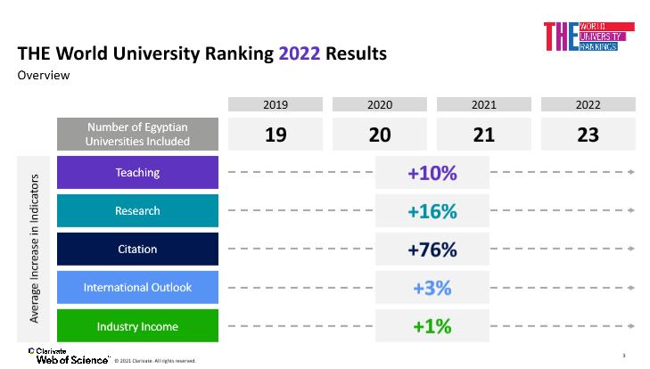 ويعزى تقدم مؤسسات التعليم العالي بجمهورية مصر العربية في مؤشرات تصنيف التايمز إلى سياسات البحث العلمي وزيادة تمويله، فضلًا عن التعاون مع الباحثين من دول العالم المختلفة، كما ساهمت جودة الأبحاث المشتركة في تسجيل عدد كبير من الاستشهادات، وبالتالي تمتعها بفرصة أكبر للنشر في مجلات عالية التأثير.