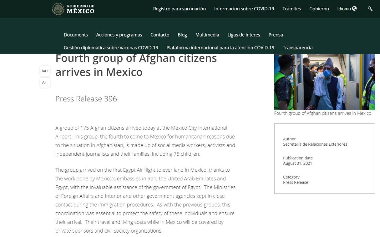 وأصدرت دولة المكسيك بيانًا رسميًا، تشكر فيه السلطات المصرية على إيصال المواطنين الأفغان إلى المكسيك، قائلةً: إن المواطنين الأفغان تمكنوا من السفر للمكسيك بفضل جهود السفارات المكسيكية في إيران والإمارات ومصر وبفضل المساعدة التي لا تقدر بثمن التي قدمتها الحكومة المصرية.