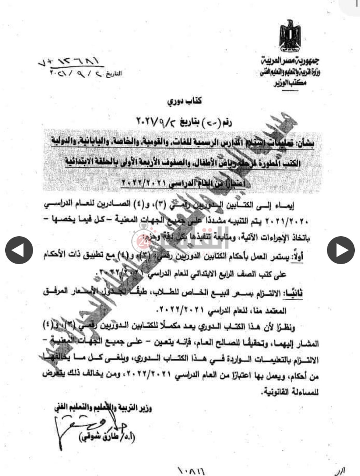 وجهت وزارة التربية والتعليم كتابًا دوريًا للمديريات التعليمية، بشأن عمليات تسلم المدارس الرسمية للغات، والقومية والخاصة، واليابانية والدولية للكتب المطورة لمرحلة رياض الأطفال، والصفوف الأربعة الأولى بالحلقة الابتدائية