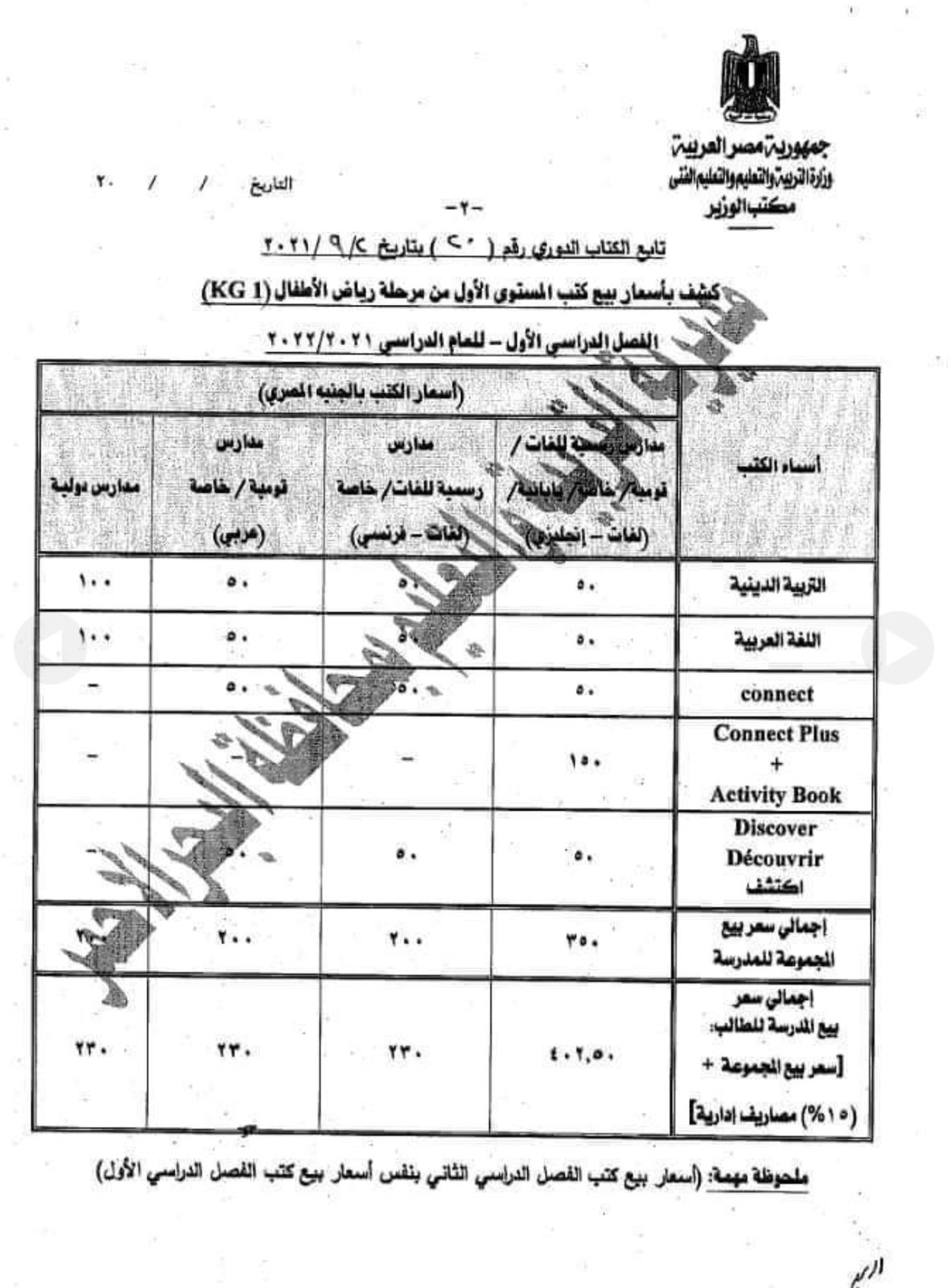 8-إجمالي سعر بيع المدرسة للطالب (سعر بيع المجموعة + 15% مصروفات إدارية) 460 جنيهًا للمدارس الرسمية لغات والمدارس القومية والمدارس الخاصة والمدارس اليابانية (لغات - إنجليزي) - 287.50 جنيه للمدارس الرسمية لغات خاصة فرنسية، و287.50 جنيه للمدارس القومية والخاصة العربي و345 جنيهًا للمدارس الدولية.