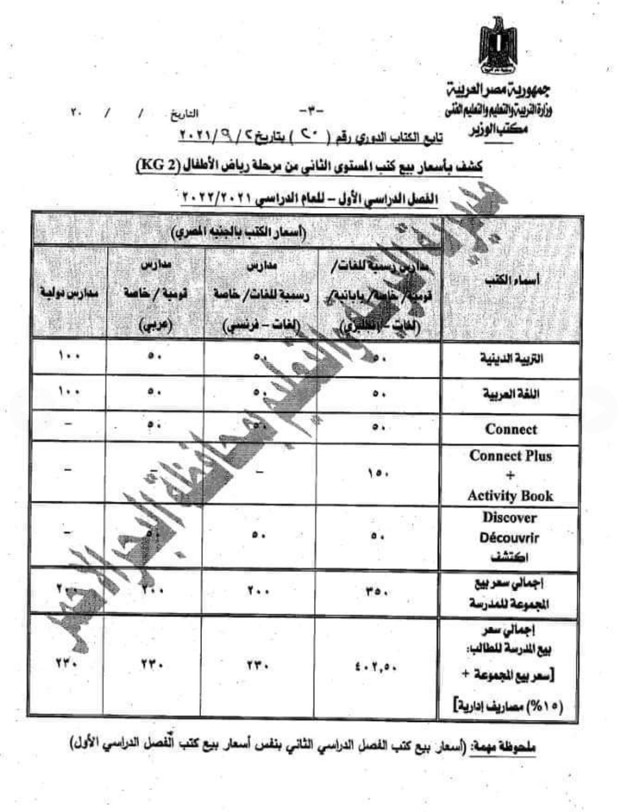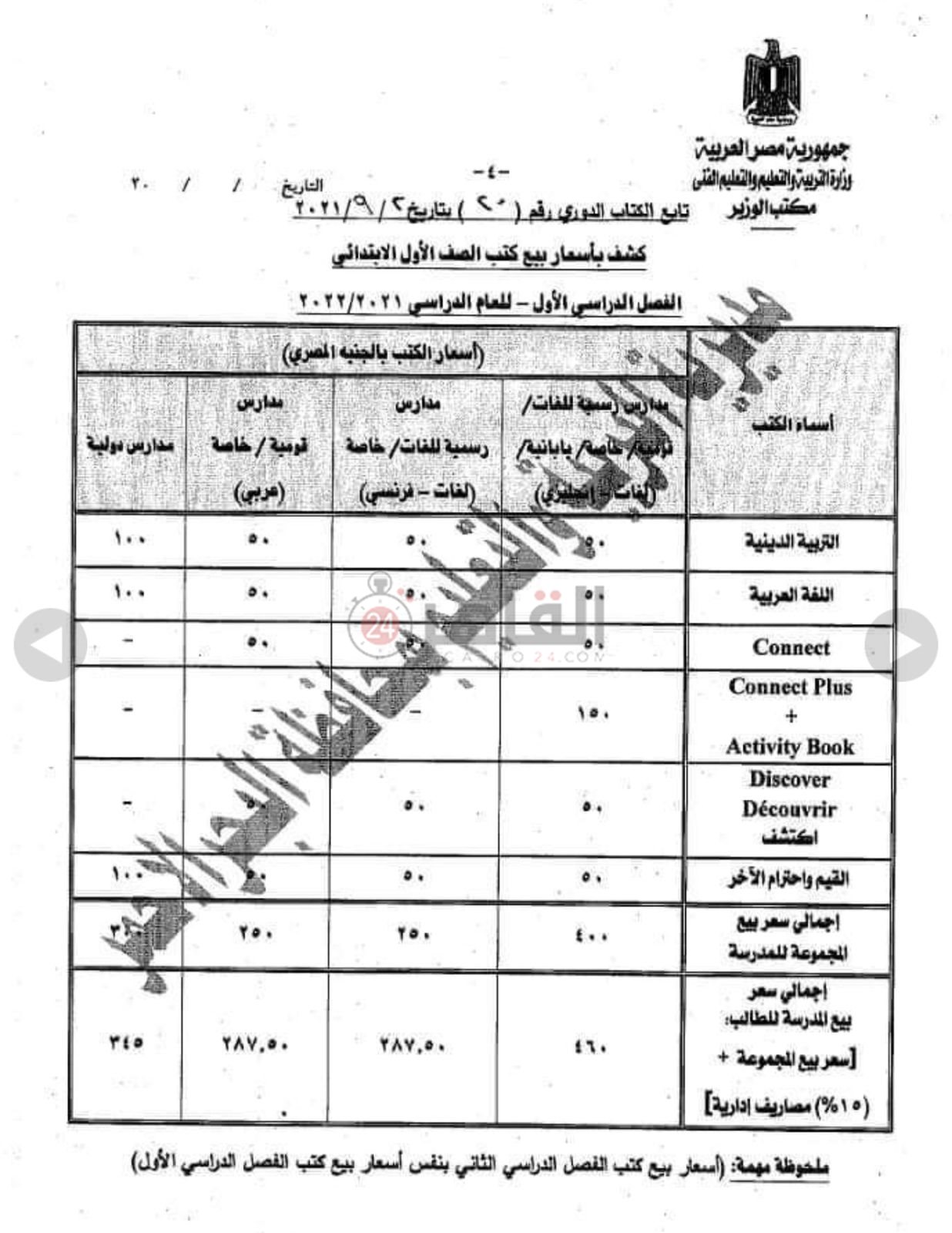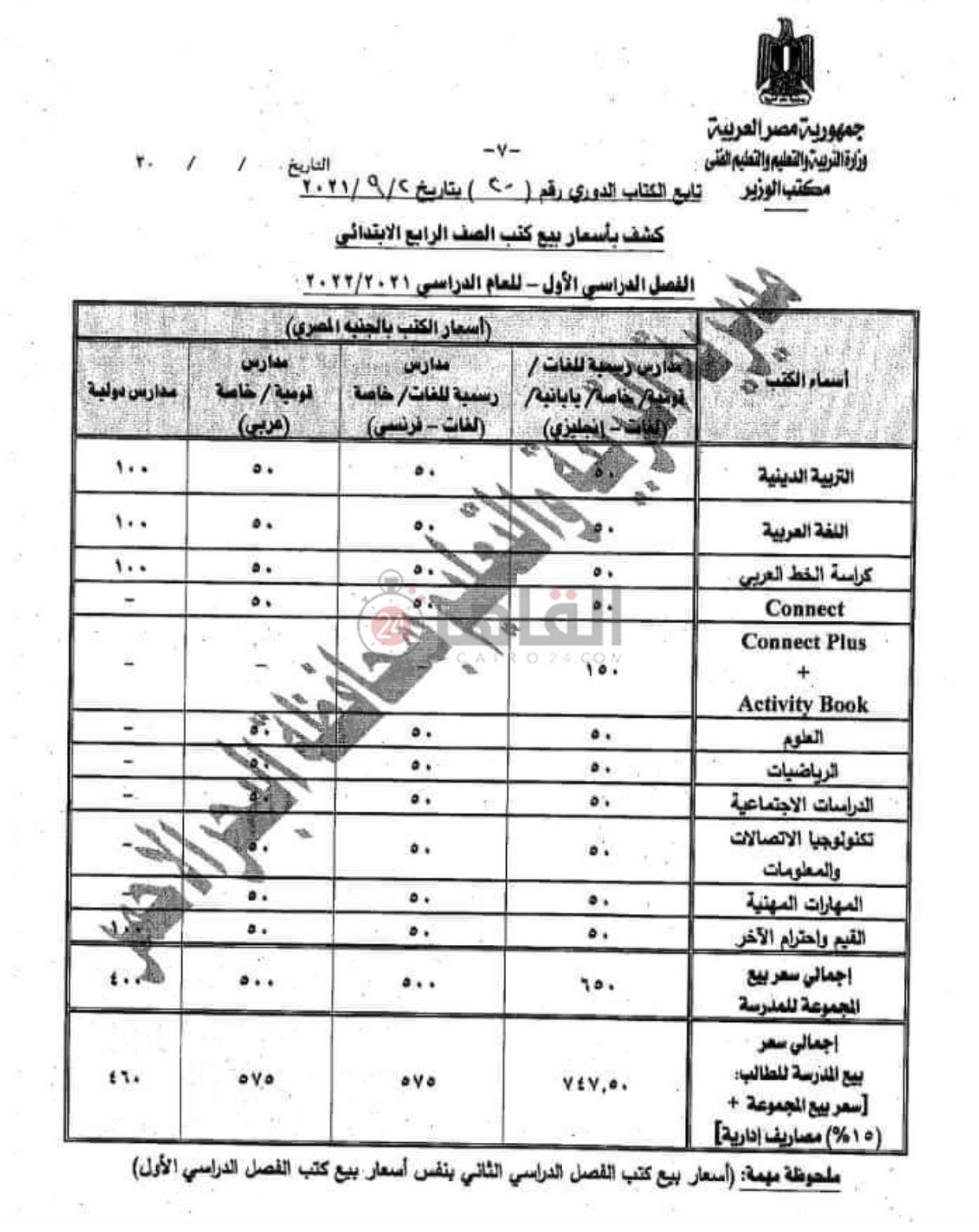 6- كتاب القيم واحترام الآخر: 50 جنيهًا للمدارس الرسمية لغات والمدارس القومية والمدارس الخاصة والمدارس اليابانية (لغات - إنجليزي) والمدارس الرسمية لغات وخاصة فرنسي والمدارس القومية والخاصة العربي، و100 جنيه المدارس الدولية.