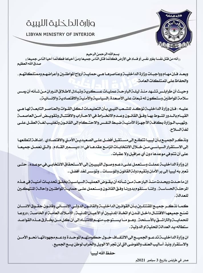 عقبت وزارة الداخلية الليبية، على الاشتباكات العنيفة والدامية التي شهدتها العاصمة طرابلس أمس، بين وحدتين عسكريتين، مؤكدة أن تعليماتها لكل القوات والعناصر التابعة لها هي القيام بالدور المنوط بها وفق القانون وعدم الانخراط في الاقتتال وتقويض أمن العاصمة.