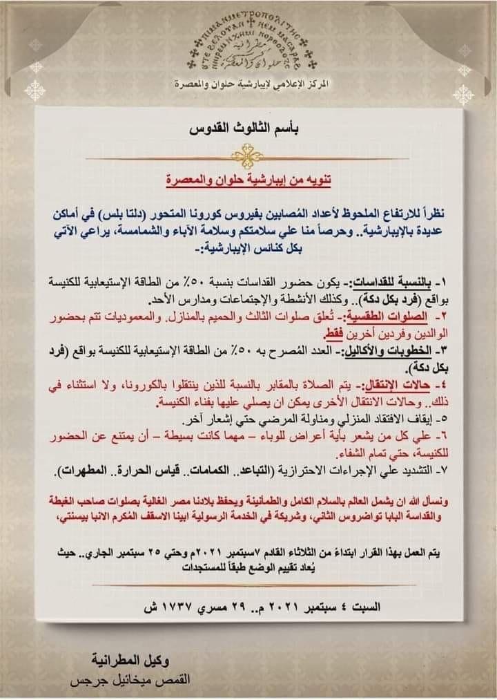 اتخذت إيبارشية حلوان والمعصرة و15 مايو، عدة إجراءات عاجلة في أعقاب الزيادة الملحوظة في أعداد الإصابة بفيروس كورونا.