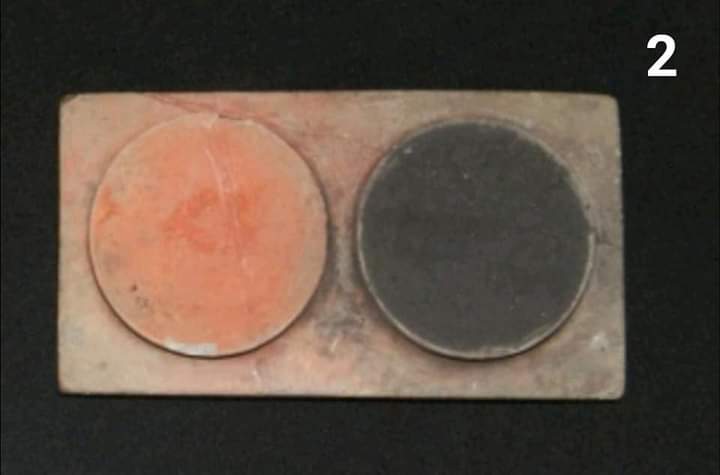 2- محبرة بها تجويفان أحدهما لوضع المداد الأحمر والآخر لوضع المداد الأسود، وهي مصنوعة من الشست وطولها 11سم.