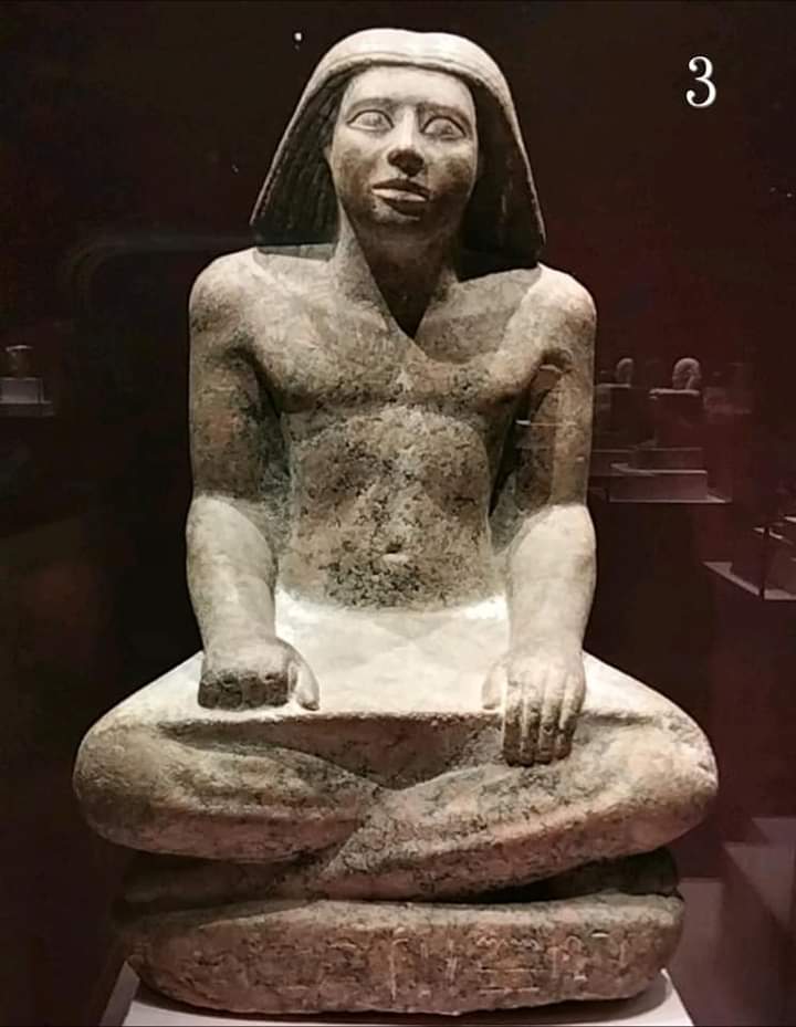 3- تمثال الكاتب المصري "رع-حتب"، مصنوع من الجرانيت الوردي، وهو في وضع الجلوس واليد اليسرى مبسوطة، واليد اليمنى تقبض على لفة البردي، وتظهر تفاصيل الوجه واضحة وتحديد العين باللون الأسود، وعلى قاعدة التمثال كتابات بالخط الهيروغليفي، ويبلغ ارتفاع التمثال 51 سم.