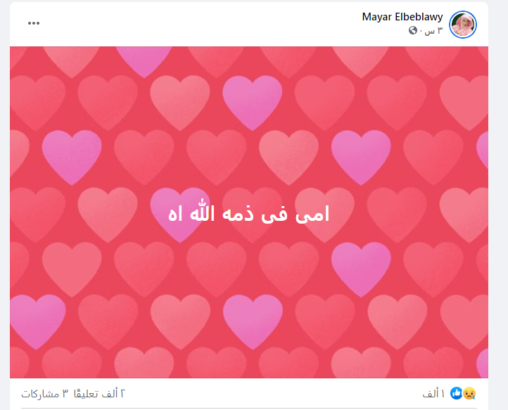 وكتبت ميار الببلاوي على حسابها الخاص بموقع التواصل الاجتماعي فيس بوك: «أمي في ذمه الله».