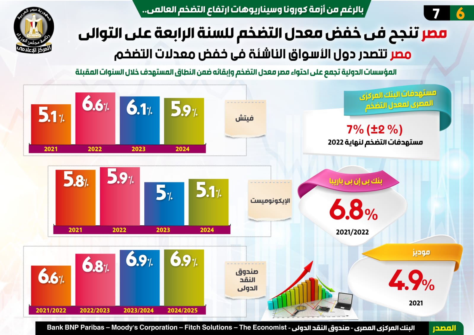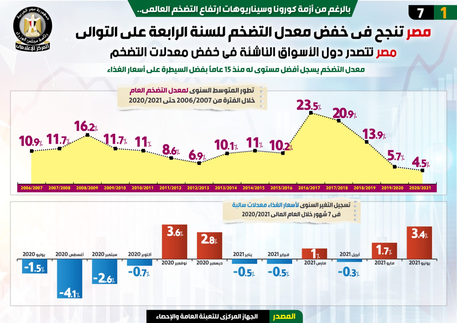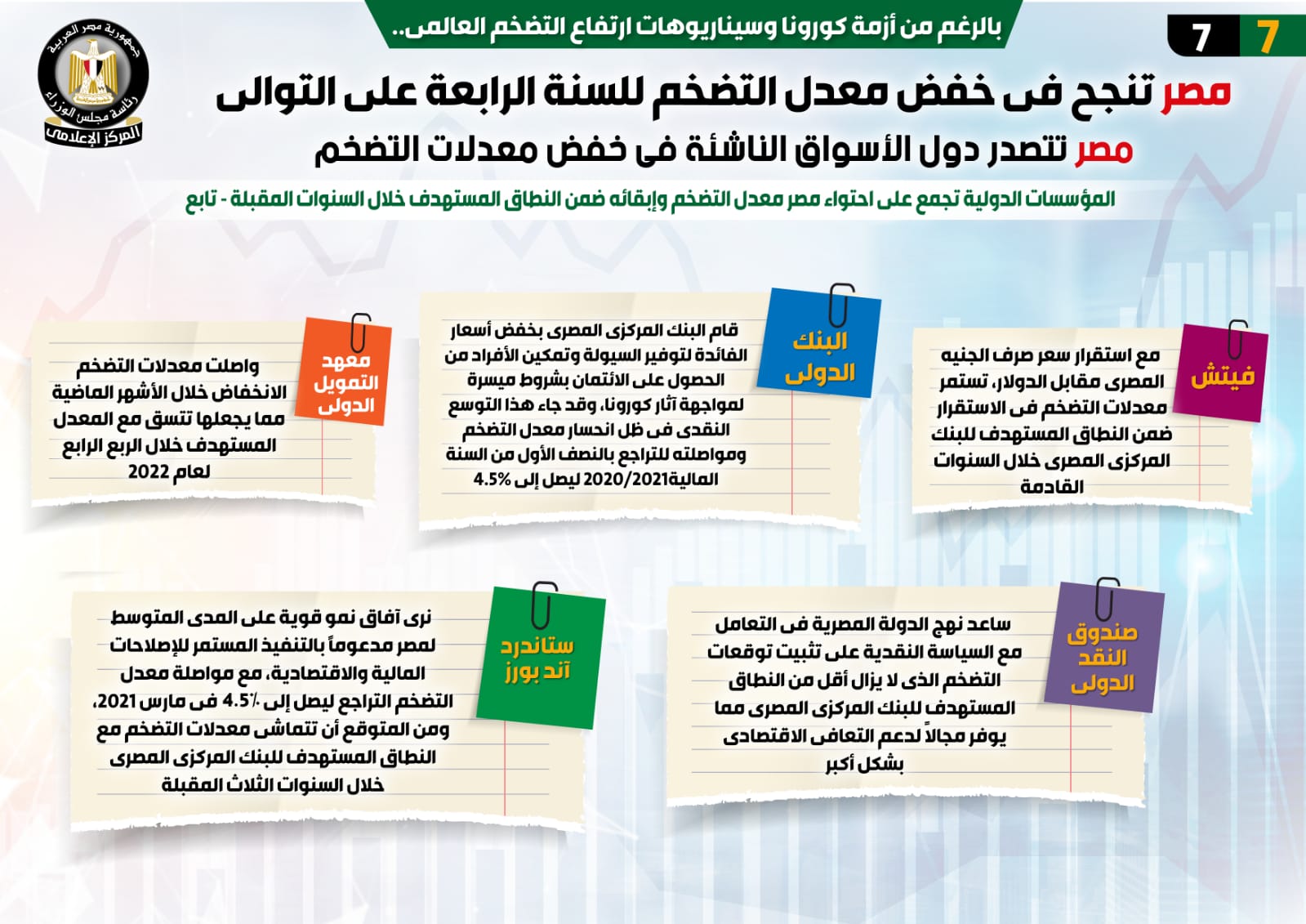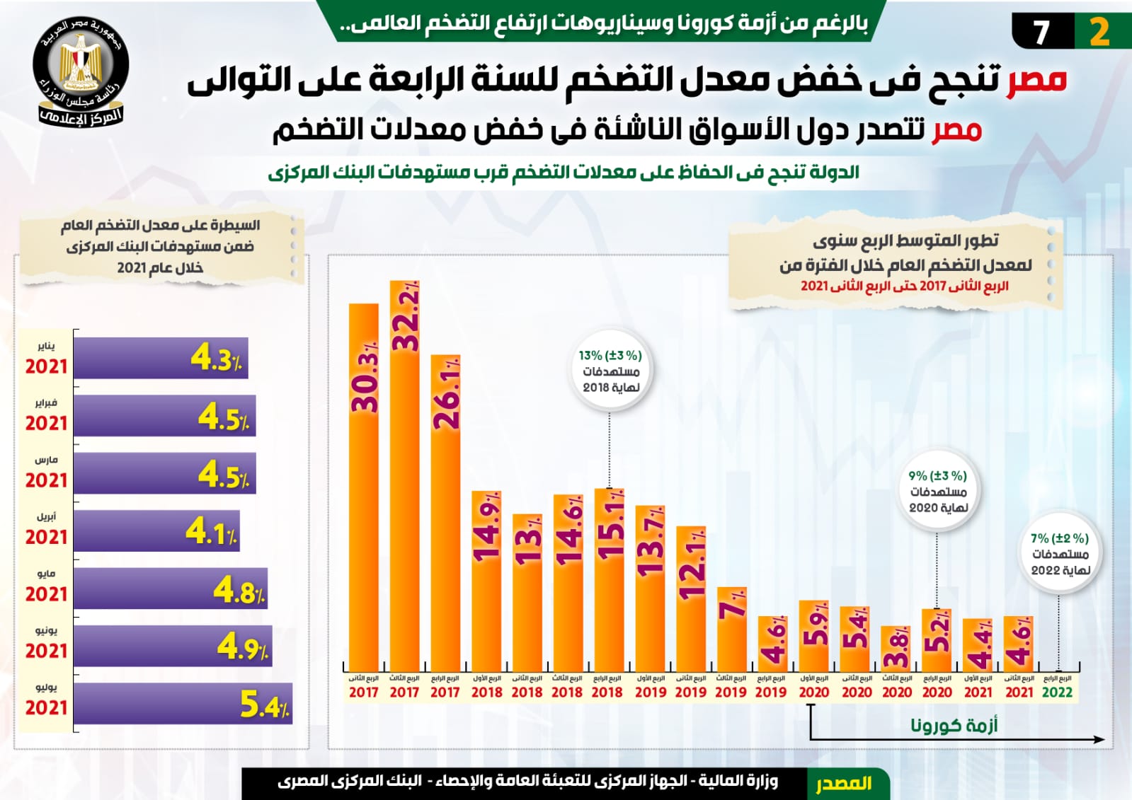 وفي هذا الصدد نشر المركز الإعلامي لمجلس الوزراء تقريرًا تضمن انفوجرافات تسلط الضوء على نجاح مصر في تحقيق خفضًا متتاليًا لمعدل التضخم للسنة الرابعة على التوالي، لتتصدر دول الأسواق الناشئة في خفض معدلات التضخم، وذلك بالرغم من أزمة كورونا وسيناريوهات ارتفاع التضخم العالمي.