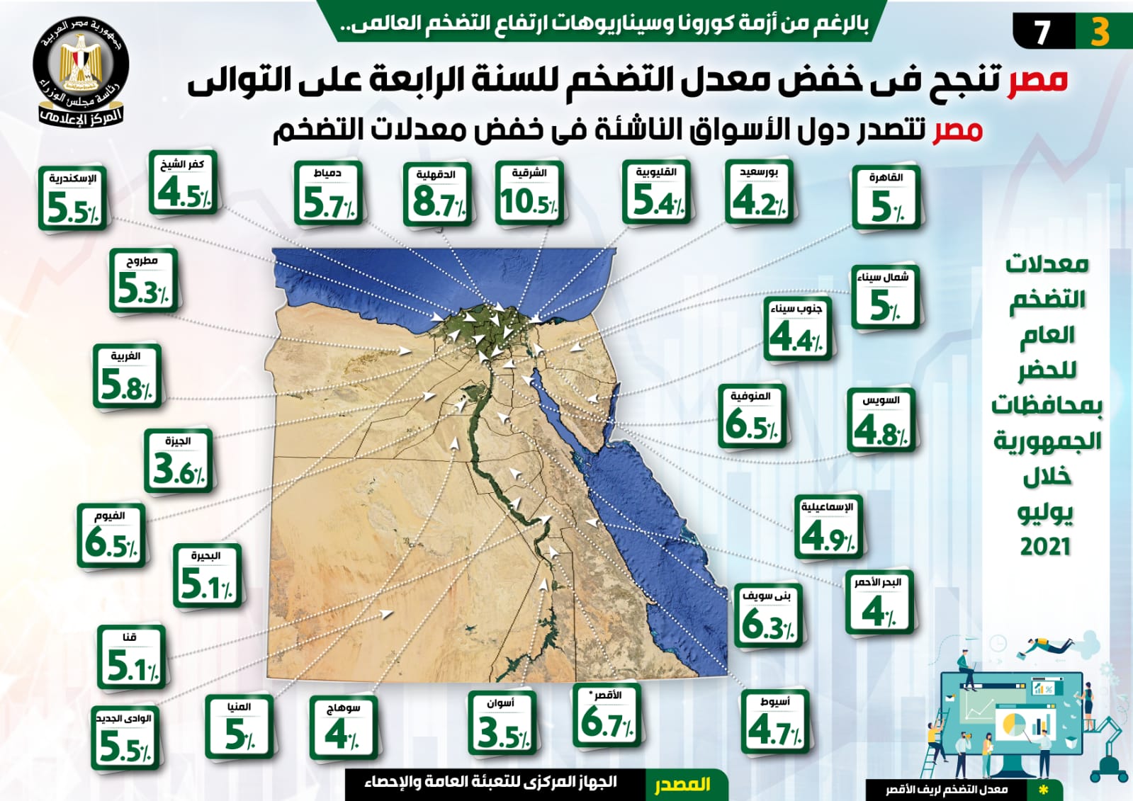 تم للمرة الأولى داخل التقرير نشر معدل التضخم العام للحضر بمحافظات الجمهورية وذلك خلال يوليو 2021، حيث سجل 5% بمحافظات القاهرة والمنيا وشمال سيناء، و5،1% في كل من البحيرة وقنا، و5،5% في كل من الإسكندرية والوادي الجديد، و4% في كل من البحر الأحمر وسوهاج، و4،2% في بورسعيد، و5،4% في القليوبية، و4،4% في جنوب سيناء.