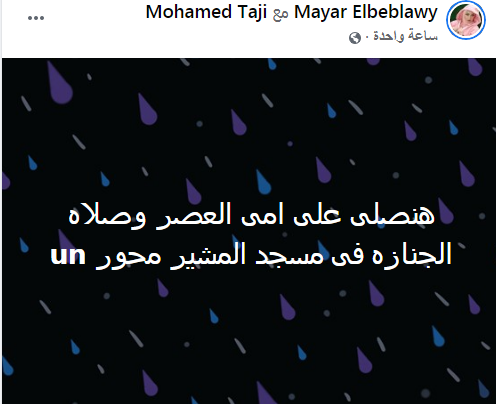 وكتبت ميار الببلاوي منشورًا عبر حسابها الشخصي بموقع التواصل الاجتماعي فيس بوك، تُعلن من خلاله موعد ومكان تشييع الجثمان، قائلة: هنصلي على أمي العصر، وصلاة الجنازة في مسجد المشير، بجوار محور un.