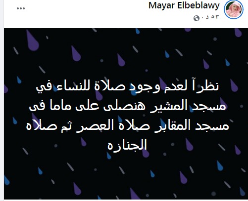 وكتبت الفنانة ميارالببلاوي منشورًا، عبر حسابها الشخصي بموقع التواصل الاجتماعي فيس بوك، تُعلن من خلاله تغيير مكان صلاة الجنازة، قائلة: نظرًا لعدم وجود صلاة للنساء في مسجد المشير، هنصلي على ماما في مسجد المقابر صلاة العصر، ثم صلاة الجنازة.