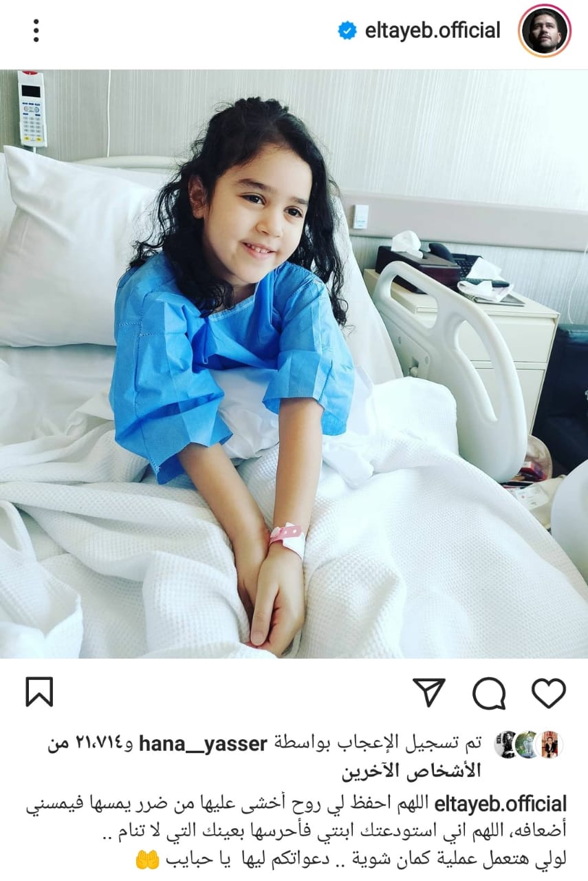 علّق الفنان علي الطيب على الصورة قائلًا: «اللهم احفظ روحًا أخشى عليها من ضرر يمسها، فيمسني اضعافه، اللهم إني استودعتك ابنتي فاحرسها بعينك التي لا تنام.. لولي هتعمل عملية كمان شوية دعواتكم ليها يا حبايب».