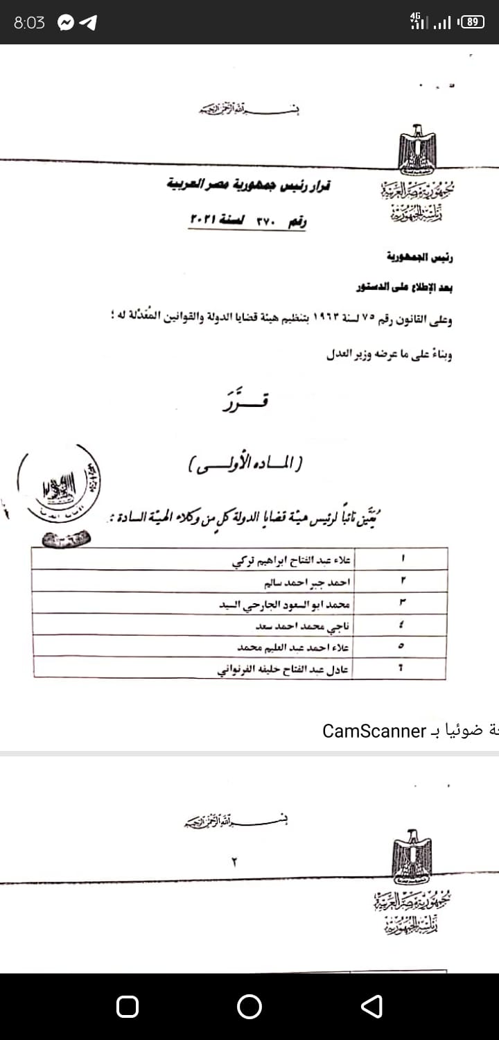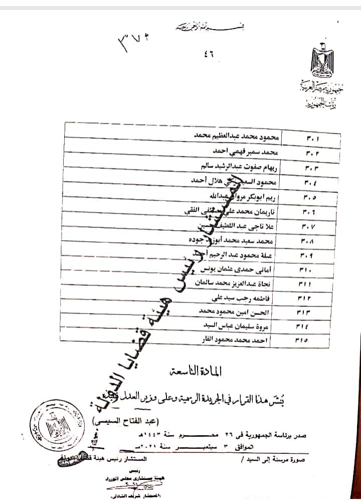 وتضمنت مادته الثانية ترقية عدد 4 وكيلًا هيئة قضايا الدولة، وتضمنت مادته الثالثة تعيين عدد 98 مستشارًا من الفئة أ.