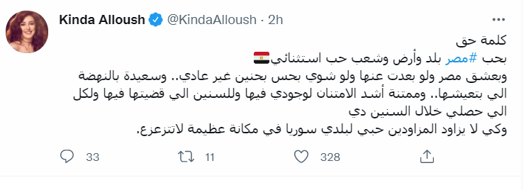 نشرت كندة علوش، تدوينة عبر حسابه الشخصي بموقع التغريدات القصيرة “تويتر”، وقالت: «كلمة حق بحب مصر بلد وأرض وشعب حب استثنائي وبعشق مصر ولو بعدت عنها ولو شوي بحس بحنين غير عادي.. وسعيدة بالنهضة اللي بتعيشها».