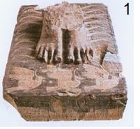 1- قاعدة تمثال من الحجر الجيري الملون عليها قدمي الملك زوسر واسم والقاب إيمحتب بجوار اسم الملك زوسر.