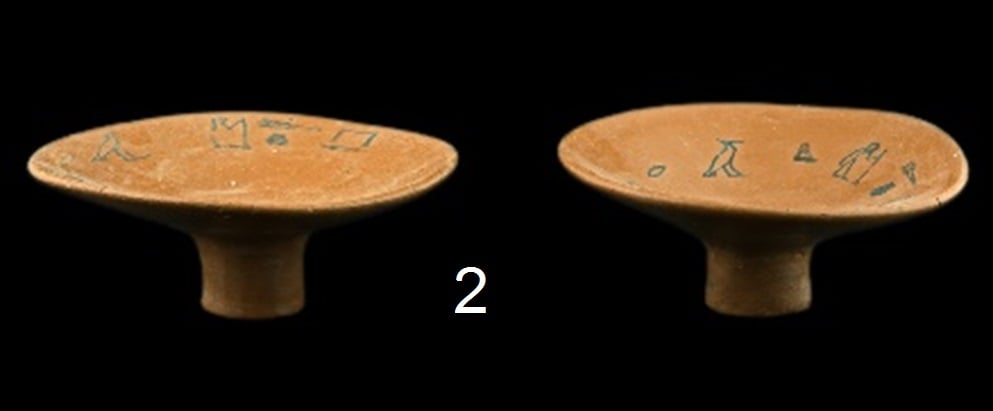2- غطاء إناء من الفخار الأحمر دائري الشكل له مقبض دائري وتجويف من الداخل وعليه اسم قار بالمداد الأسود.