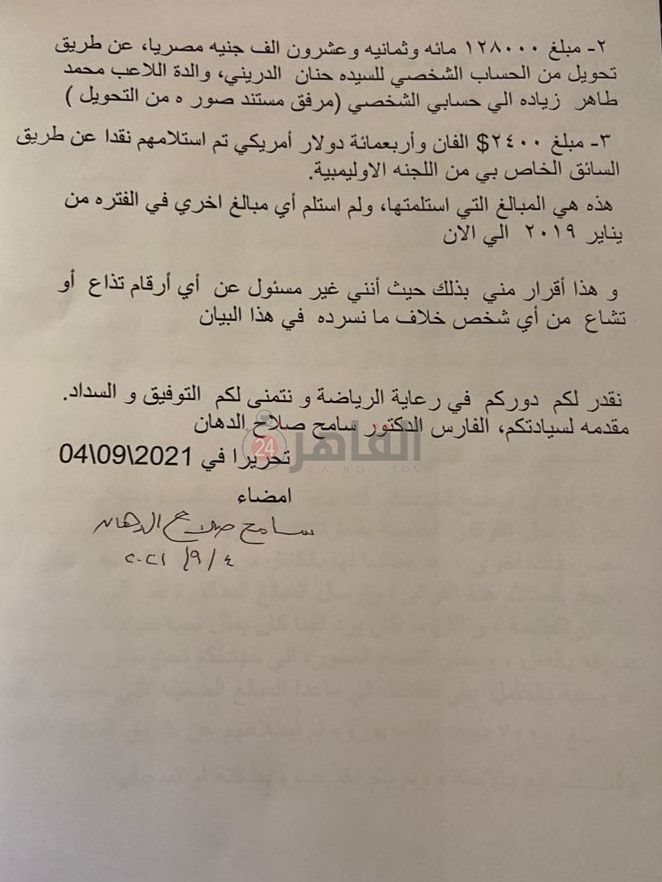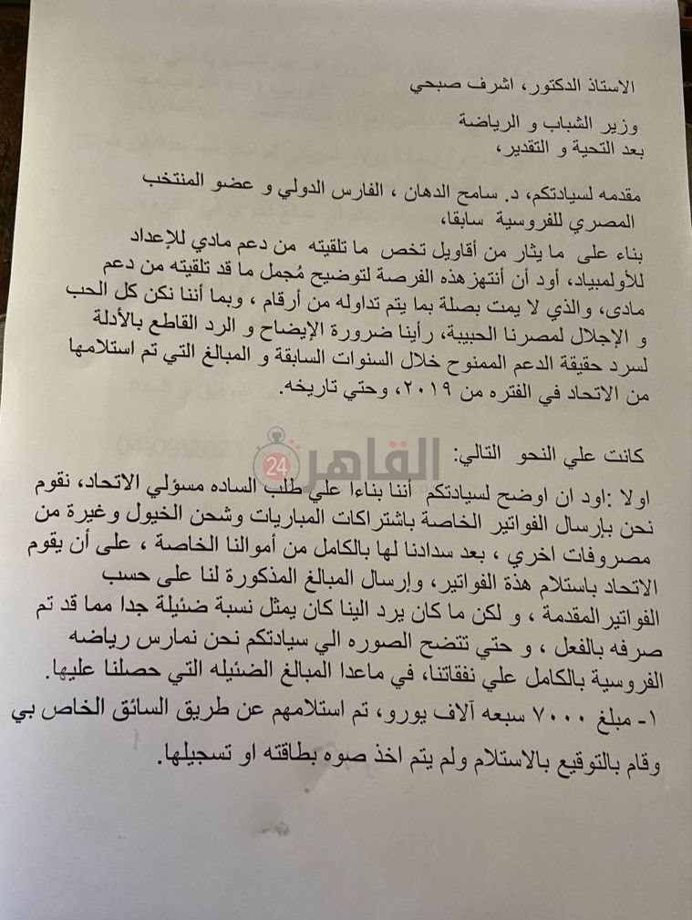 حصل القاهرة 24 على نص خطاب مُوجه من الدكتور سامح الدهان، الفارس الدولي وعضو المنتخب المصري للفروسية سابقًا للدكتور أشرف صبحي، وزير الشباب والرياضة، يكشف خلاله عن وجود تلاعب فيما يتم الإعلان عنه من أرقام مبالغ مالية تم توجيهها لدعم منتخب الفروسية خلال أولمبياد طوكيو 2020.