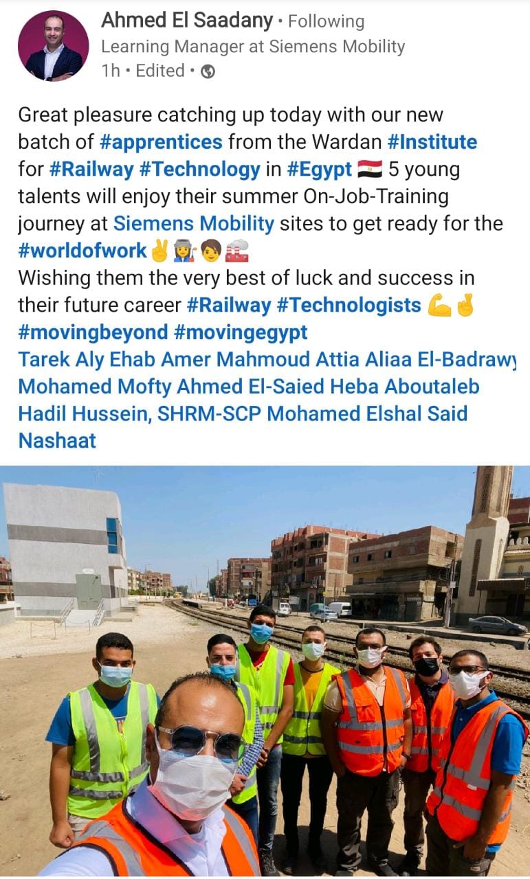 دون مسؤول شركة سيمنز الألمانية عبر موقع التواصل الاجتماعي قائلا: “تشرفت اليوم بمقابلة المجموعة الجديدة للعمل بالسكة الحديد من مصر وهم 5 شباب موهوبين يشاركون في رحلة التدريب الصيفي التي توفرها شركة سيمنز من أجل أن يستعدوا لعالم الأعمال الحقيقي.. ونتمنى لهم كل التوفيق والنجاح في مستقبلهم العملي”.